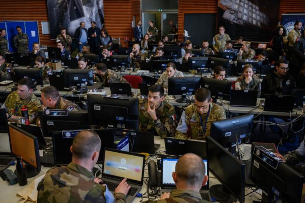 | Des participants de divers pays, dont des membres de l'Armée de l'air et de l'espace (AAE) française, lors de la 4e édition de l'exercice spatial militaire Aster X au Centre national d'études spatiale. |