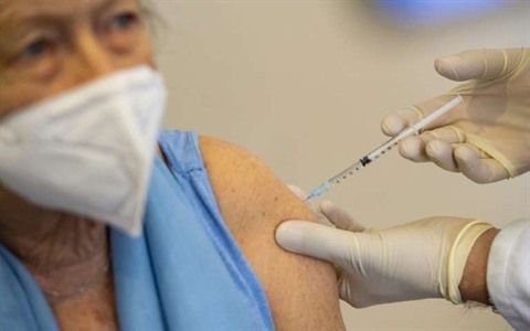 | Une personne âgée reçoit une dose du vaccin anti-COVID AstraZeneca dans le cabinet d'un médecin généraliste à Deisenhofen, dans le Sud de l'Allemagne, le 31 mars. |