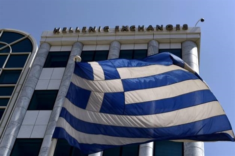 | Le drapeau grec flotte devant le siège de la Bourse d'Athènes. |