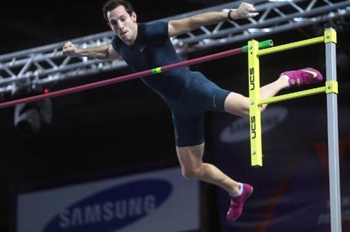 | Le perchiste Renaud Lavillenie bat le record du monde en salle de saut à la perche, le 15 février à Donetsk (Ukraine). |
