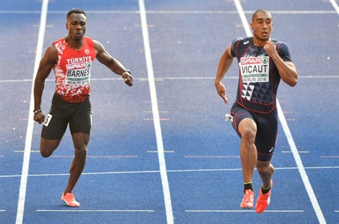 | Le Français Jimmy Vicaut (droite) en demi-finales du 100 m aux Championnats d'Europe, le 7 août à Berlin. |
