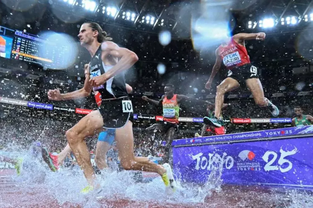 | Le Néo-Zélandais Geordie Beamish (gauche), lors de la finale du 3000 m steeple masculin, pendant les Championnats du monde d'athlétisme, à Tokyo, le 15 septembre. |