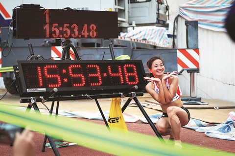 | Nguyên Thi Oanh pose avec son record national du 5.000 m. |