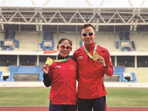 | Thành Ngung et sa grande sœur Thanh Phúc exhibent leurs médailles d’or aux Championnats nationaux d’athlétisme 2021. |