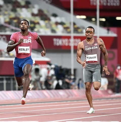 | L'Américain Fred Kerley et le Canadien Andre De Grasse, lors de la demi-finale du 100m aux Jeux olympiques de Tokyo 2020, le 1er août au Stade Olympique. |