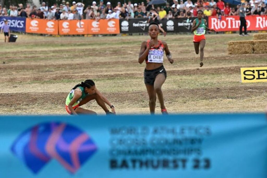| L'Éthiopienne Letesenbet Gidey s'effondre, laissant la Kényane Beatrice Chebet gagner le titre mondial de cross-country le 18 février 2023 à Bathurst en Australie |