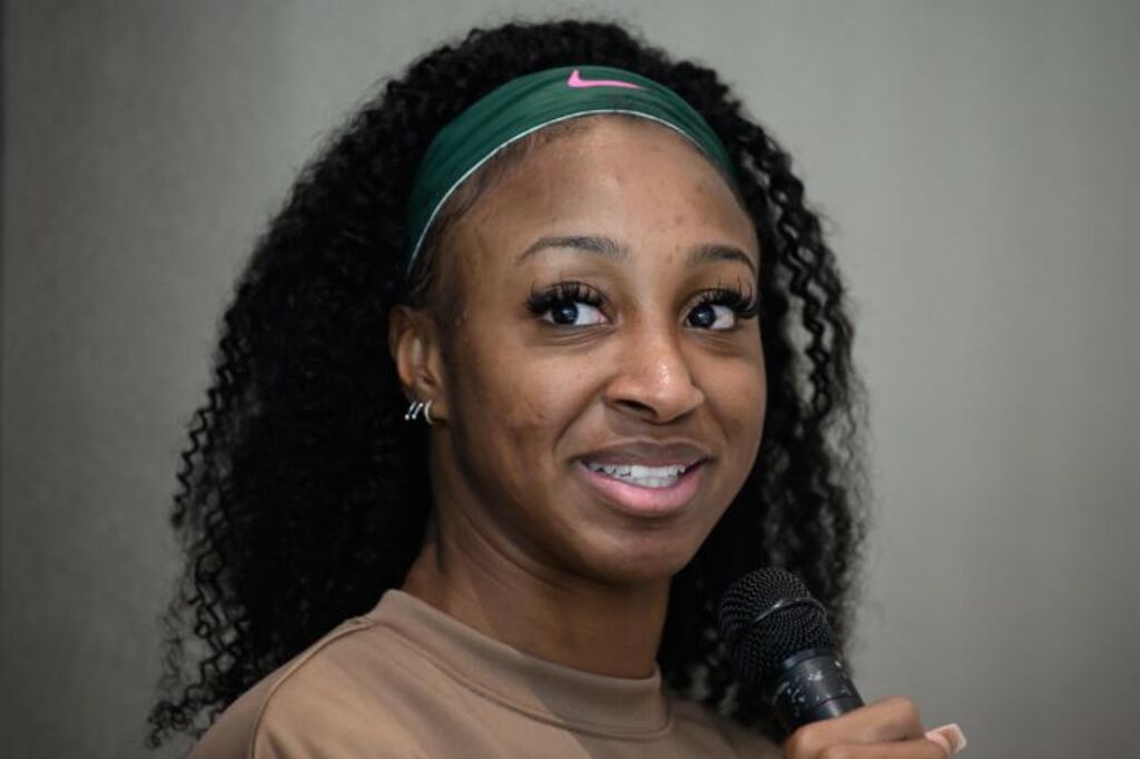 | La Portoricaine Jasmine Camacho-Quinn, championne olympique du 100 m haies, en conférence de presse le 29 juin en amont du Meeting d'athlétisme de Lausanne. |