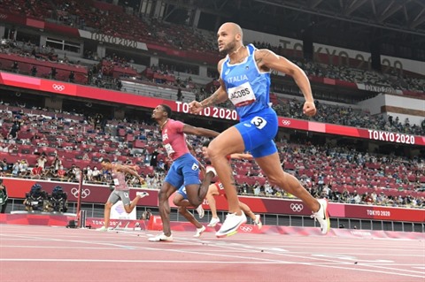 | L’Italien Lamont Marcell Jacobs (droite), champion olympique du 100m devant l'Américain Fred Kerley, le 1er août aux Jeux olympiques de Tokyo 2020. |