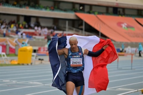 | L'espoir de l'athlétisme français Sasha Zhoya célèbre sa victoire sur 110m haies aux Mondiaux juniors de Nairobi, le 21 août. |