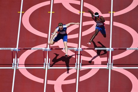 | Le Norvégien Karsten Warholm devance l'Américain Rai Benjamin lors de la finale du 400m haies, le 3 août 2021 aux Jeux olympiques de Tokyo. |