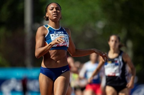 | Rénelle Lamote lors du 800 m aux Championnats de France, à Saint-Etienne, le 28 juillet 2019. |