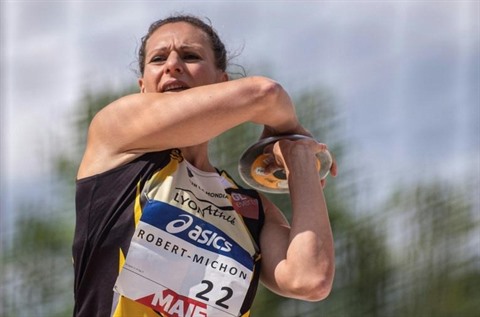 | Mélina Robert-Michon lors de la finale du lancer du disque au Championnats de France, à Saint-Etienne, le 28 juillet 2019. |
