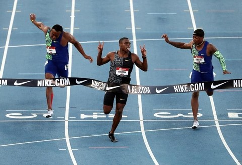 | L'Américain Christian Coleman (c) vainqueur du 100 m lors des Championnats des Etats-Unis au Drake Stadium de Des Moines dans l'Iowa, le 25 juillet 2019. |