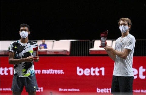 | L'Allemand Alexander Zverev (droite), victorieux du tournoi de Cologne, et le Canadien Félix Auger-Aliassime (gauche), finaliste, le 18 octobre à Cologne. |