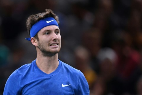 | Le Français Corentin Moutet lors de son match contre le Serbe Novak Djokovic au 2e tour du Masters 1000 de Paris, le 3 octobre 2019. |