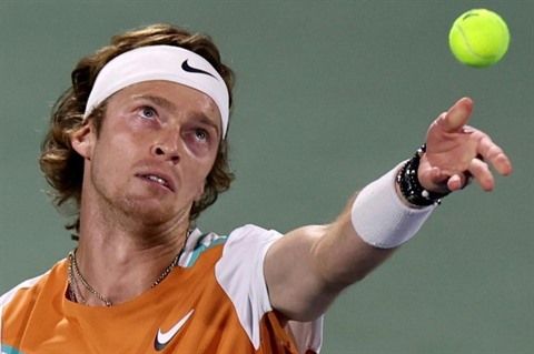 | Le Russe Andrey Rublev lors de son match gagné face à l'Allemand Alexander Zverev au tournoi ATP de Dubai, le 3 mars. |