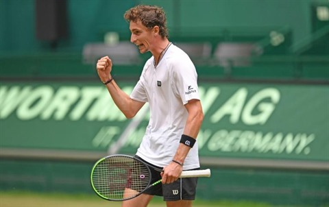 | Le Français Ugo Humbert savoure sa victoire en demi-finale du tournoi de Halle contre le Canadien Félix Auger-Aliassime, le 19 juin |