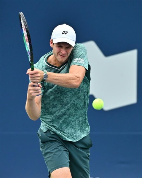 | Le Polonais Hubert Hurkacz contre l'Espagnol Albert Ramos au 3e tour du Masters 1000 de Montréal le 11 août à Montréal. |