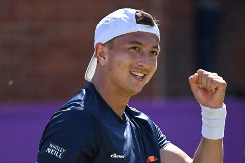 | Le Britannique Ryan Peniston, après sa victoire, 7-6 (7/4), 7-6 (7/2), face au Norvégien Casper Ruud, le 14 juin, au 1er tour du tournoi sur gazon du Queen's. |