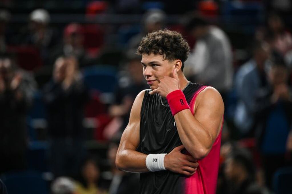 | L'Américain Ben Shelton fête sa victoire contre l'Italien Jannik Sinner au tournoi de Shanghai en mimant un appel téléphonique le 10 octobre à Shanghai en Chine. |