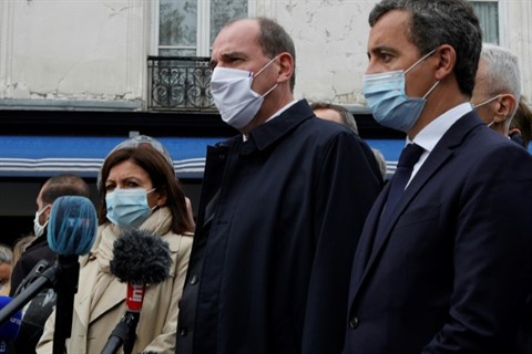 | (De droite à gauche) Jean Castex, Gérald Darmani et la maire de Paris Anne Hidalgo, devant les anciens locaux de "Charlie Hebdo" à Paris le 25 septembre. |