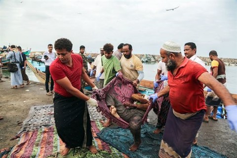 | Les corps des réfugiés somaliens tués au large du Yemen sont débarqués dans la ville portuaire yéménite de Hodeida, le 17 mars. Photo : AFP/VNA/CVN |