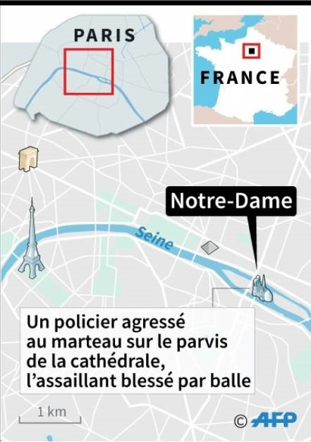 L'attaque a eu lieu à 16h20, dans l'une des quartiers les plus surveillés de Paris et haut lieu du tourisme. Le policier agressé faisait partie avec deux autres collègues d'une patrouille de surveillance de l'édifice catholique, a indiqué M. Collomb.