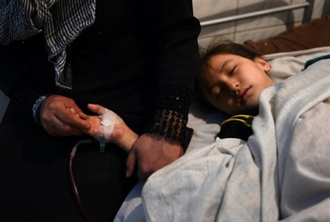 | Une jeune fille, blessée dans l'attaque contre la mosquée de Karte Sakhi, est soignée à l'hôpital Ali Abad de Kaboul, le 11 octobre. |