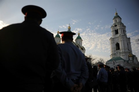 | Des policiers rassemblés sur une place à Astrakhan, dans le Sud de la Russie, le 14 avril 2012. |