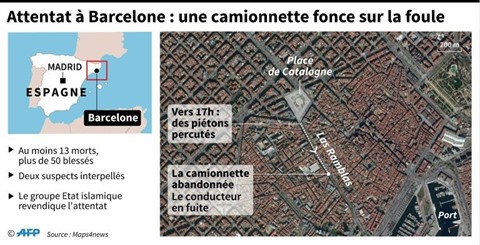 Vers 17h00 (1500 GMT), une camionnette percute la foule sur les Ramblas, l'avenue de Barcelone la plus fréquentée par les touristes espagnols et étrangers.