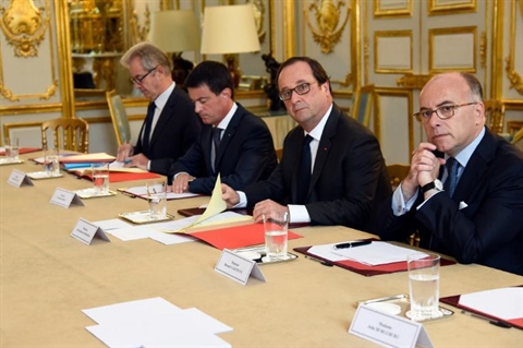 | Manuel Valls, Francois Hollande et Bernard Cazeneuve, le 27 juillet à l'Élysée lors de la réunion avec les représentants des cultes. |