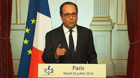 | Capture d'écran d'AFP TV du président François Hollande lors de son allocution après l'attaque terroriste à Saint-Étienne-du-Rouvray, le 26 juillet à l'Élysée à Paris |