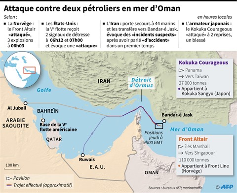 Le Kokuka Courageous, un méthanier, a essuyé des tirs et sa cargaison est intacte, selon son opérateur japonais, Kokuka Sangyo. Le navire et les 21 membres d'équipage ont été secourus par l'US Navy et escortés vers le port de Khor Fakkan aux Émirats.