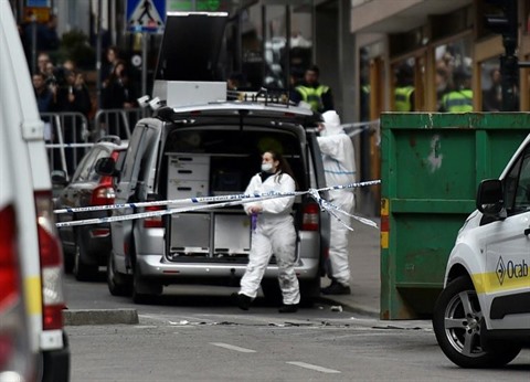 | Les experts de la police technique et scientifique sur la scène d'un attentat à Stockholm le 8 avril. |