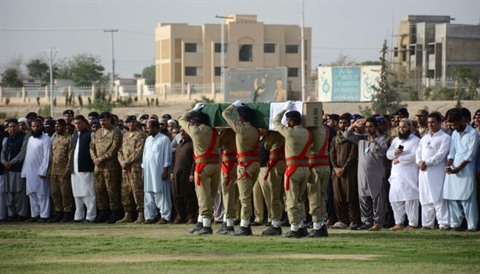 | Des soldats portent, le 14 juillet à Quetta, le cercueil de Siraj Raisani, un homme politique local tué dans un attentat suicide de Mastung, au Baloutchistan qui a fait quelque 130 morts. |