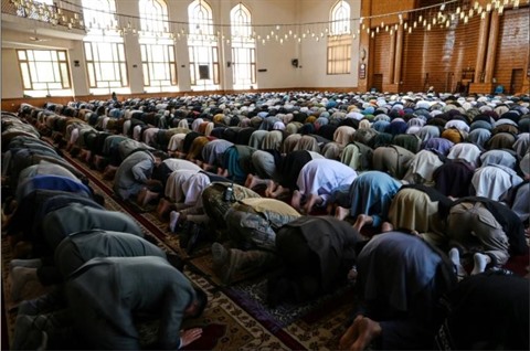 | Des musulmans prient dans une mosquée lors de l'Aïd el-Fitr, le 13 mai 2021 à Kaboul, en Afghanistan. |