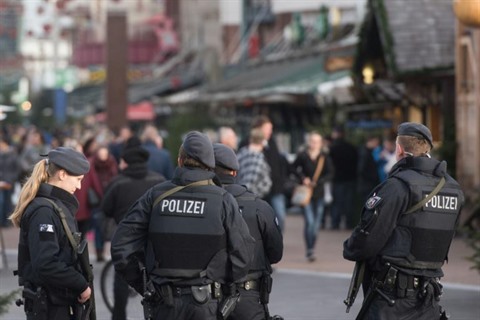 | Des policiers allemands en patrouille sur un marché de Noël près du centre commercial Centro, le 23 décembre à Oberhausen. |