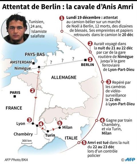 Anis Amri a ensuite été repéré par les caméras de vidéosurveillance le 22 décembre à Lyon-Part-Dieu. Puis, il a gagné par train Chambéry et enfin Milan, dans le nord de l'Italie, où il été tué dans la nuit du 22 au 23 décembre lors d'un contrôle policier de routine, après plus de trois jours de chasse à l'homme.