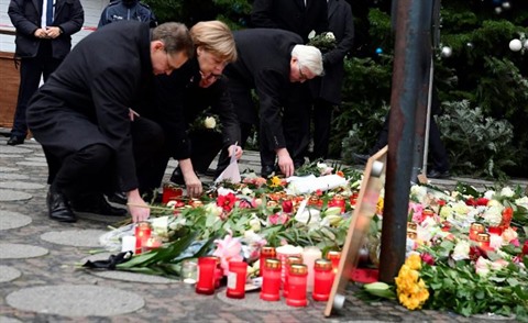 | Le maire de Berlin, Michael Mueller, la chancelière Angela Merkel, et les ministres Thomas de Maiziere et Frank-Walter Steinmeier rendent hommage aux victimes de l'attentat le 20 décembre 2016 devant le marché de Noël de Berlin. |