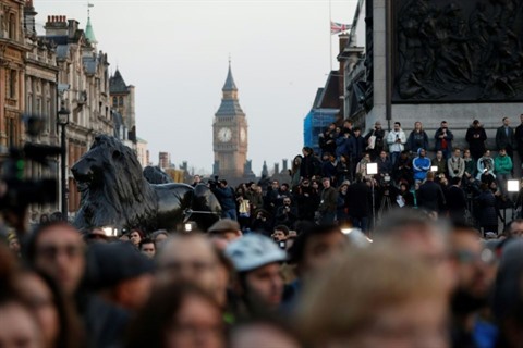 | Une veillée aux chandelles en mémoire des victimes rassemble quelques centaines de personnes à Trafalgar Square, le 23 mars à Londres. |