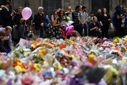 | Des fleurs en hommage aux victimes de l'attentat de Manchester, le 24 mai à Manchester. |