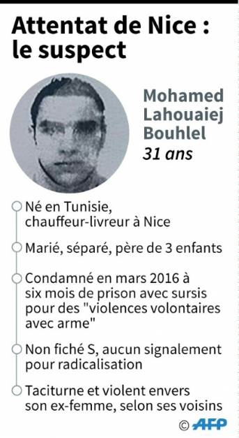 Lahouaiej-Bouhlel, père de famille de 31 ans, est décrit par ses voisins à Nice comme n'ayant aucune pratique religieuse affichée, taciturne, violent notamment envers son ex-femme, voire comme un déséquilibré.