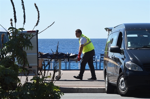 | Le corps d'une victime évacué sur une civière le 15 juillet 2016 sur la Promenade des Anglais à Nice. |