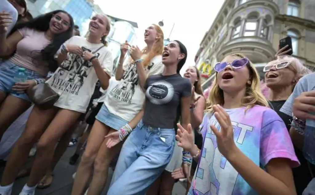 | Des fans de Taylor Swift rassemblés à Vienne le 8 août, au lendemain de l'annulation des trois concerts de la star en Autriche en raison de la menace d'un attentat au stade. |