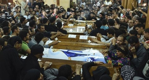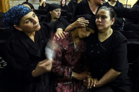 | Des proches des chrétiens coptes tués lors d'un attentat assistent aux funérailles de leurs proches, le 26 mai à Maghagha. |