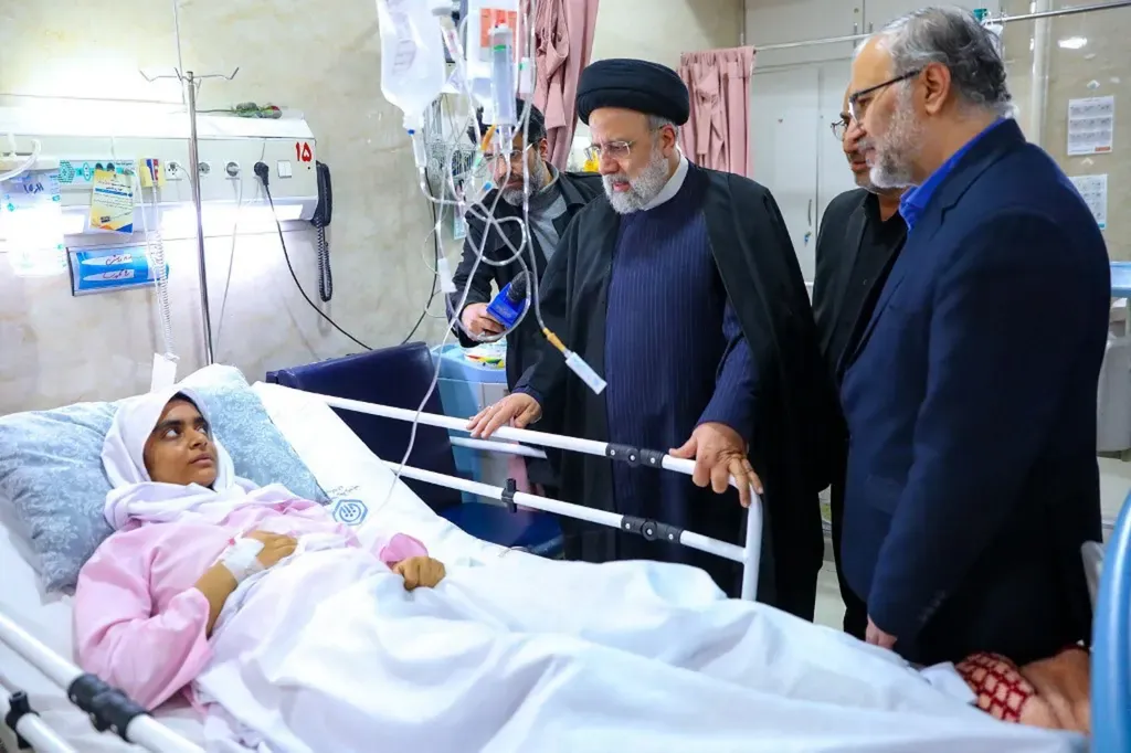 | Une photo fournie par la présidence iranienne le 5 janvier 2024 montre le président iranien Ebrahim Raisi au chevet de blessés dans les explosions du 3 janvier à Kerman. |