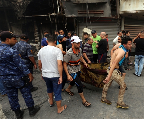 | Évacuation de corps du site d'un attentat suicide à Bagdad, le 3 juillet. |