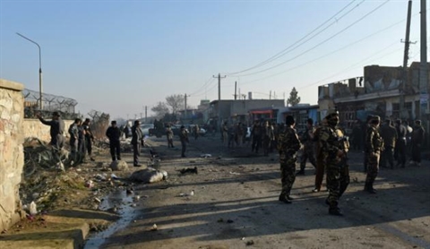 | Les forces de sécurité afghanes inspectent le lieu d'un attentat suicide près de l'aéroport international de Kaboul, le 28 décembre 2015. |