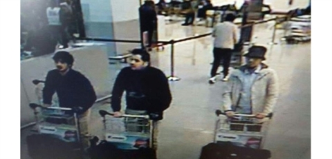 | Capture d'écran d'une video surveillance montrant les trois hommes des attentats des attentats du 22 mars à l'aéroport de Bruxelles. |