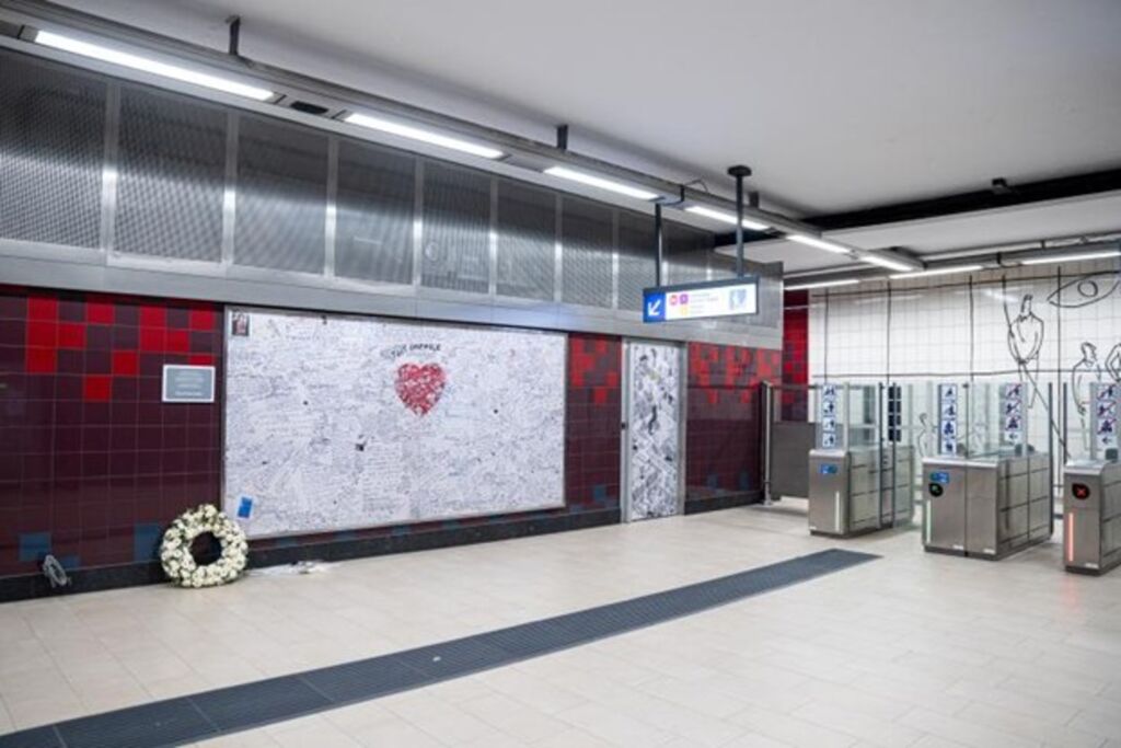 | Mur du souvenir des attentats jihadistes de mars 2016 à Bruxelles le 20 mars à la station de métro Maelbeek - Maalbeek. |